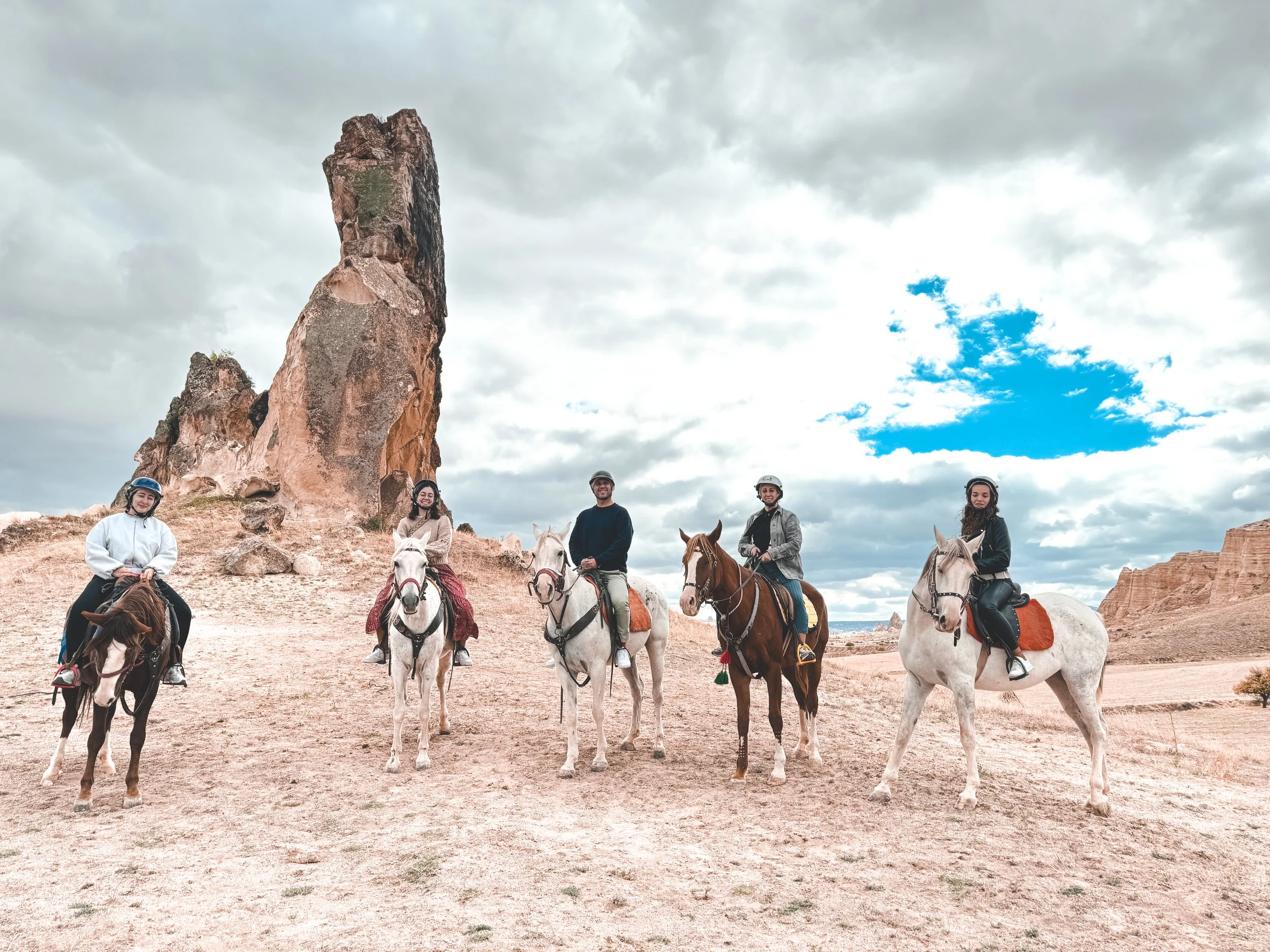 Infelizmente, não conseguimos voar de balão nos dois dias que lá estivemos devido às desfavoráveis condições meteorológicas. No entanto, conseguimos realizar mais duas atividades distintas e interessantes. Fomos fazer uma tour de um dia pela deslumbrante Capadócia, onde conhecemos os locais mais importantes e emblemáticos da região. A visita foi seguida de um passeio pelos armazéns onde são confeccionados os tradicionais tapetes e a famosa louça turca. Além disso, tivemos a oportunidade de andar a cavalo pelo encantador vale das fadas, o que foi, sem dúvida, uma experiência muito gira para quem nunca teve a oportunidade de montar num cavalo antes.